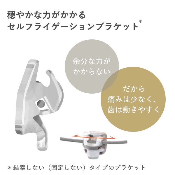 表側・裏側を問わず、ワイヤー矯正には「セルフライゲーションブラケット」を基本的に導入しています。これは、ローフォース・ローフリクションという考え方を元に作られた装置で、無理のない力で歯を動かすため、痛みや負担を軽減しながら効率的な歯の移動が見込めます。また、ワイヤーとブラケットの結びつけが簡略化されるため、調整時の作業時間も短く済むという利点があります。