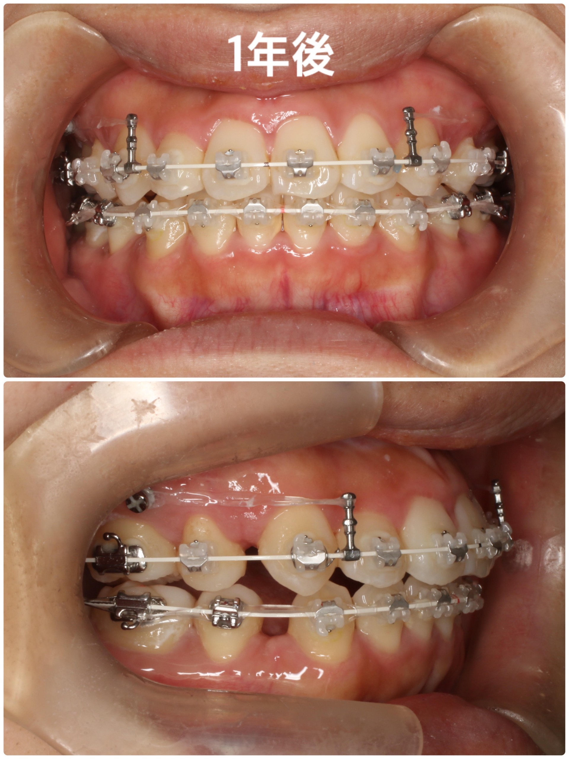 治療を開始してから約1年が経過しました。半年の時点では並びきっていなかった上顎右側の2番もしっかりと他の歯と並び、太いワイヤーを通してあります。