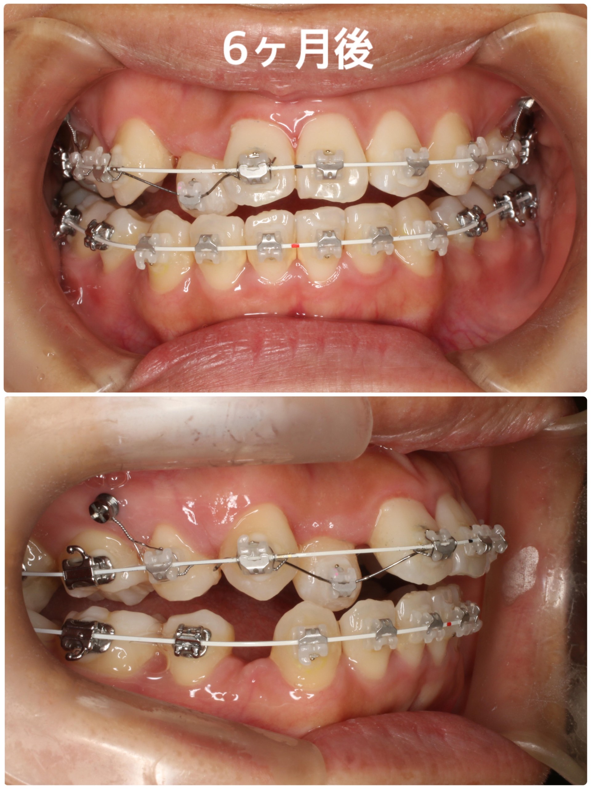 だいぶ上下の叢生が改善されたことが分かりますね!一番叢生が強かった上顎右側の2番は当初左右の歯が重なっていて装置を着けることができなかったため、治療開始から約5カ月後のある程度周囲の歯が動いた時点で装置を着けています。