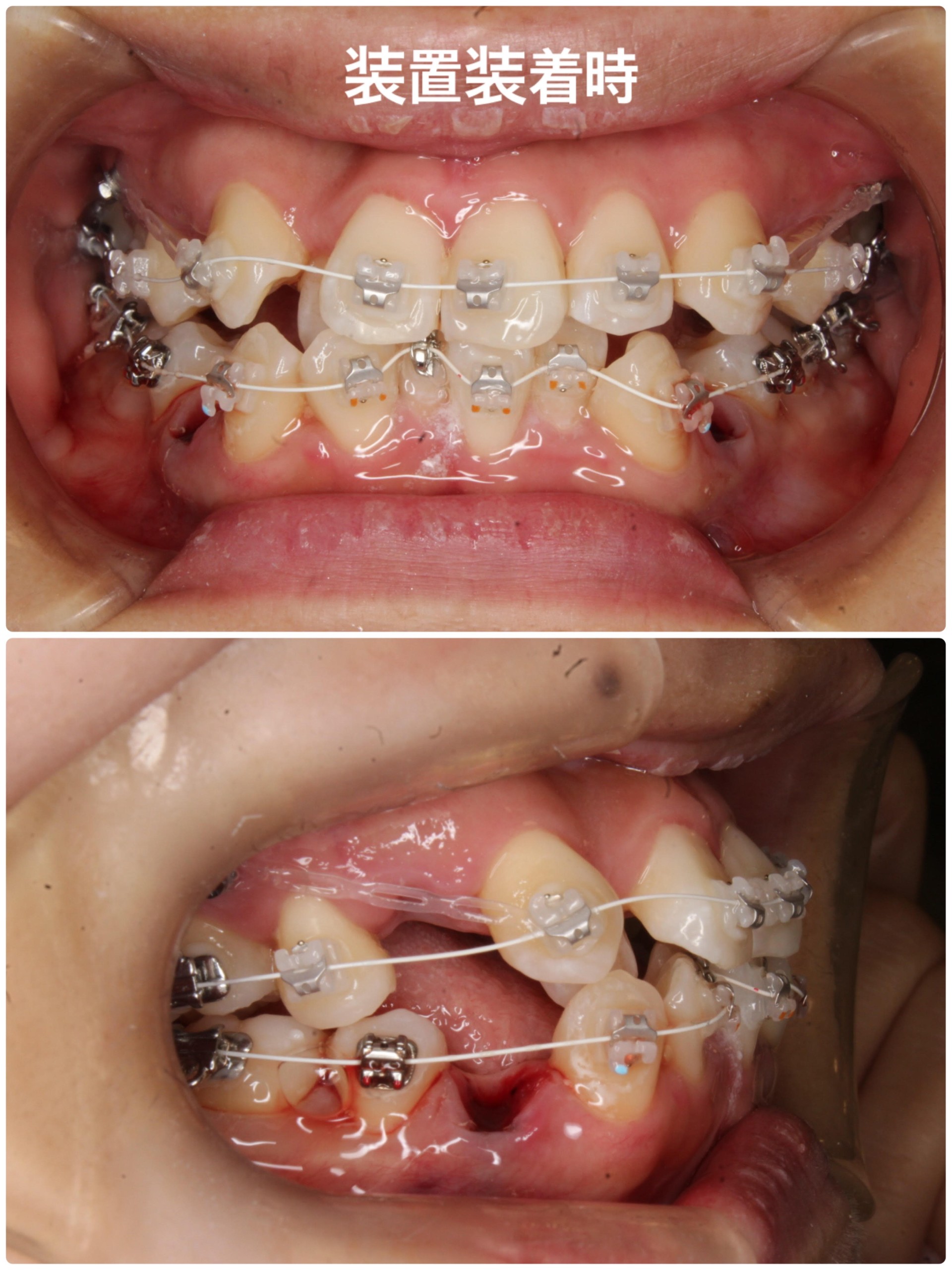 写真は上下とも装置を装着した直後のものになります。表側矯正では上下同時に装置を装着しますが、裏側矯正では上下別々に装置を装着していきます。