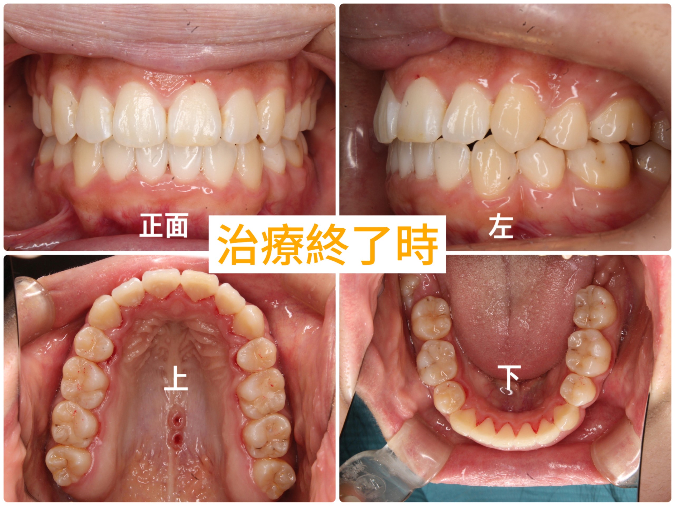 治療終了時の口腔内写真では、裏側矯正の方に多く見られる歯肉の腫れが見受けられます。