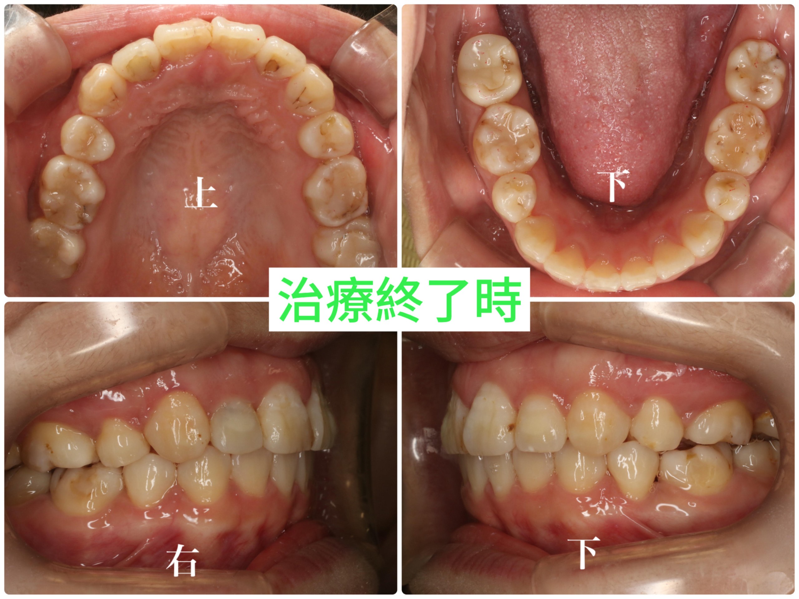 →初診時顔面正中と上下顎正中のズレに大きな差がなかったので仕上がり若干のズレが生じることご説明(患者様ご了承)