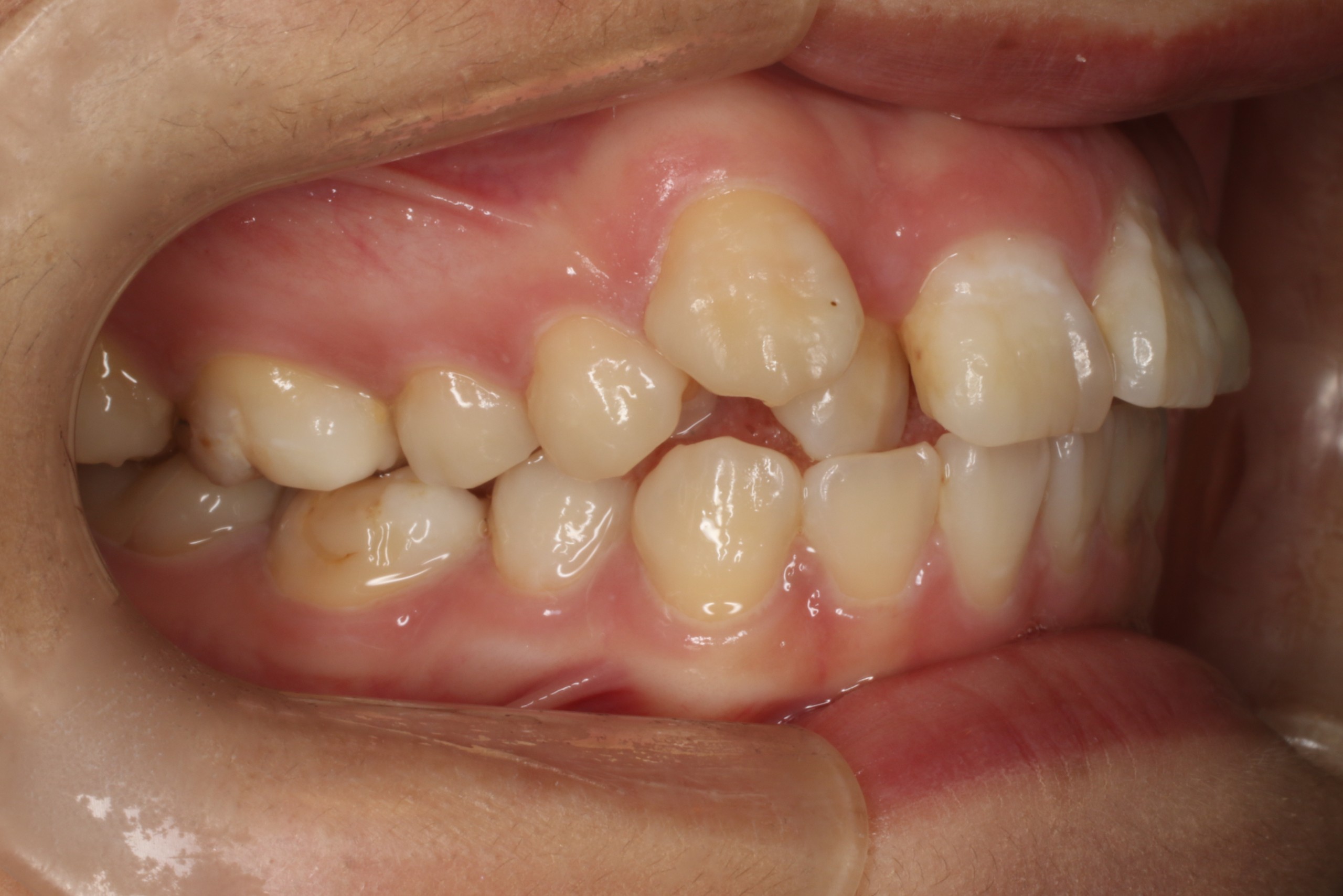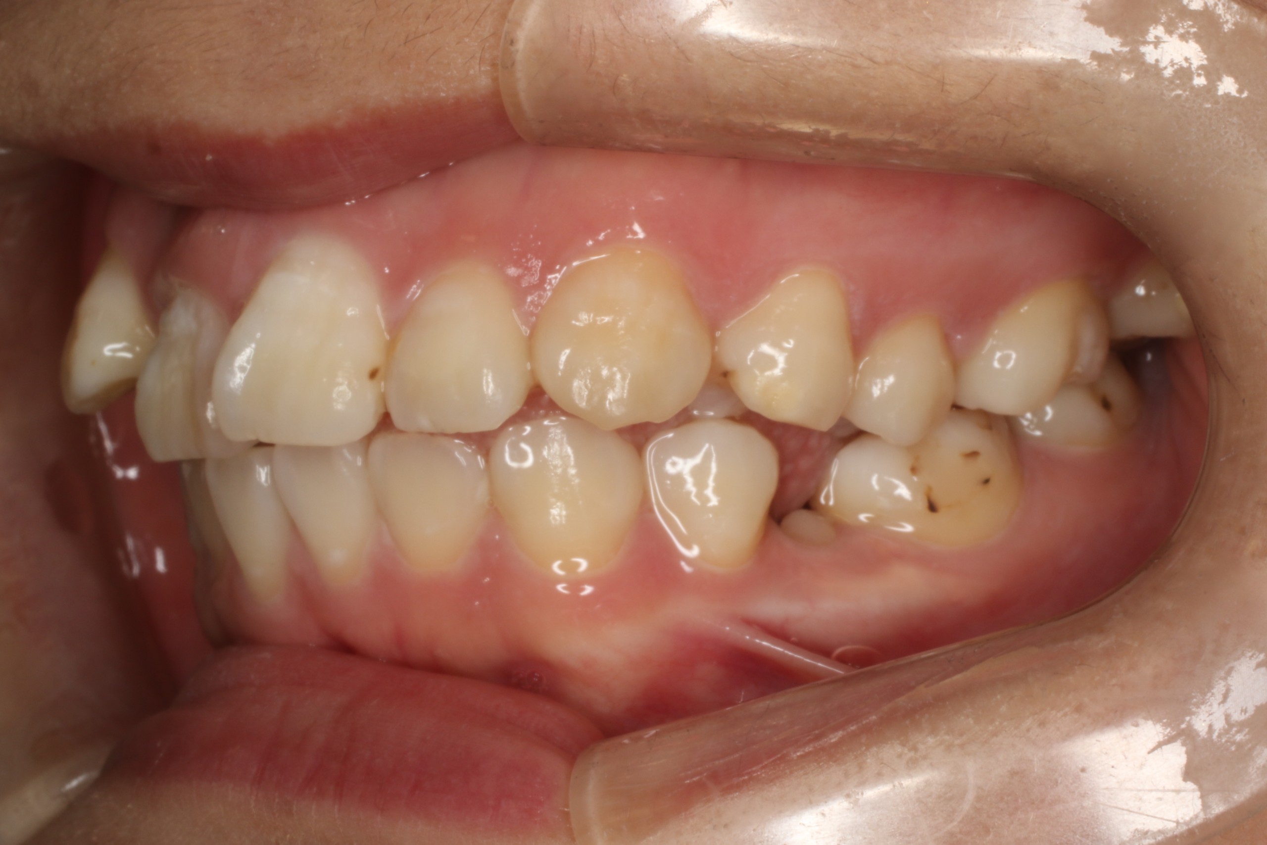 症例写真を参照にすると右のかみ合わせはⅠ級咬合ですが、左のかみ合わせはⅢ級咬合となっております。