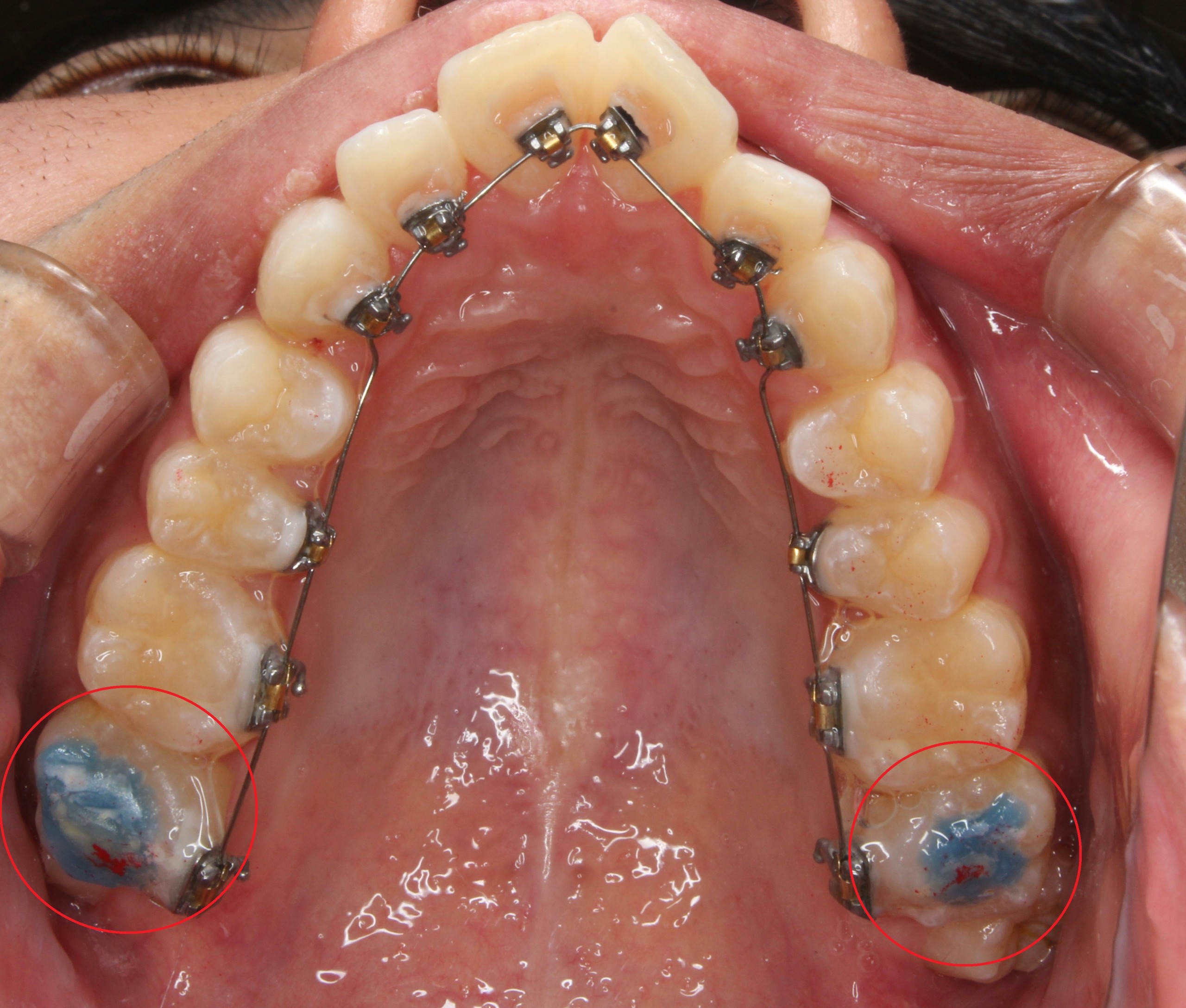 抜歯の隙間の後ろの歯に注目してください。細いワイヤーでわっかができていると思います。これはゴムをかけるためのものでご自身で小さいゴムを上下にかけていただきます。