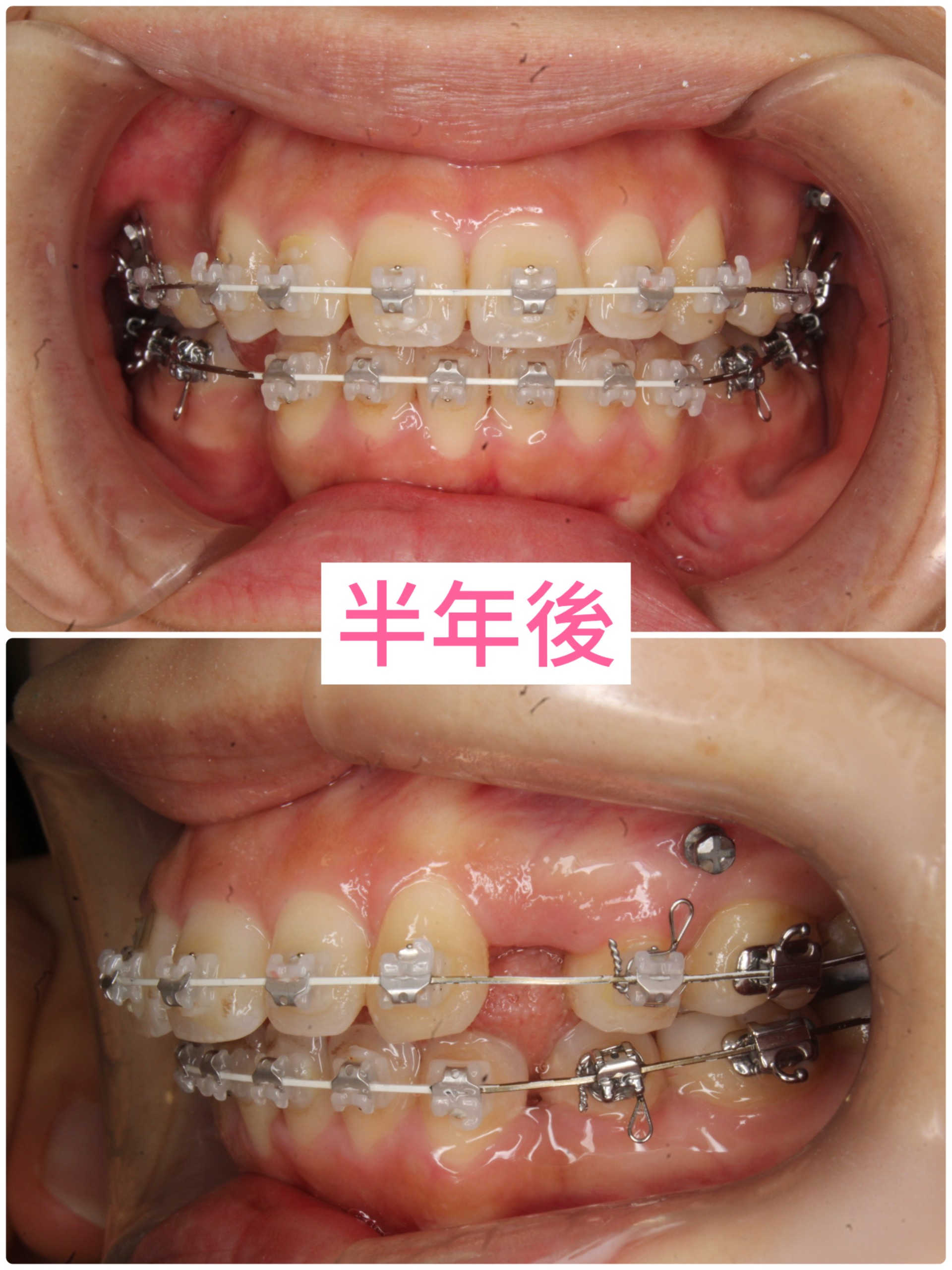 ご希望があれば目立ちにくいハーフリンガル(上が裏、下が表)や裏側矯正も可能です。しかし、今回は抜歯は必要な症例ですのでマウスピース矯正は適応ではありません。
