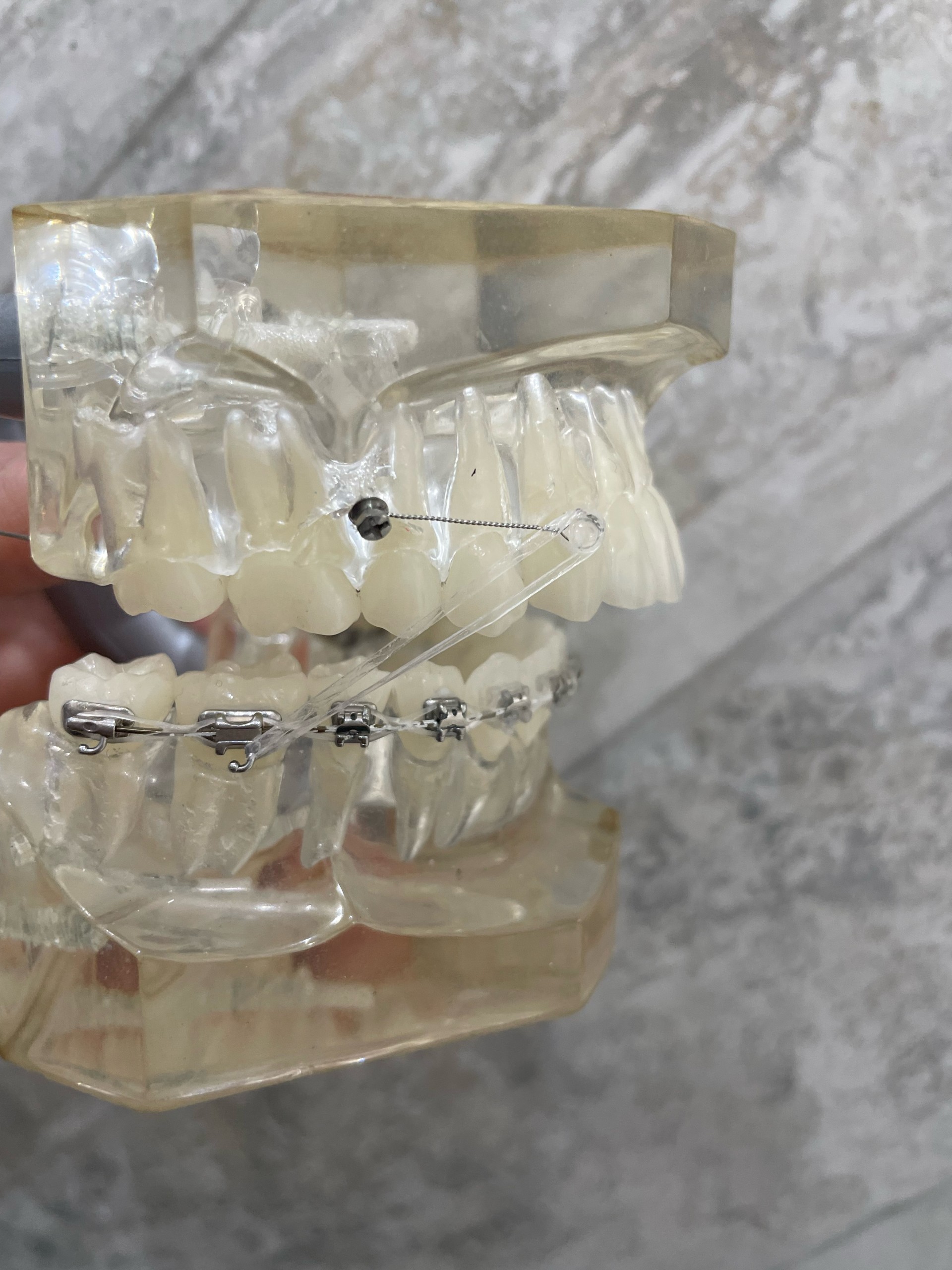 対角線上にゴムを付けることで、傾いた歯を真っすぐにしたり、内側に傾いた歯を外側に動かしたりします。