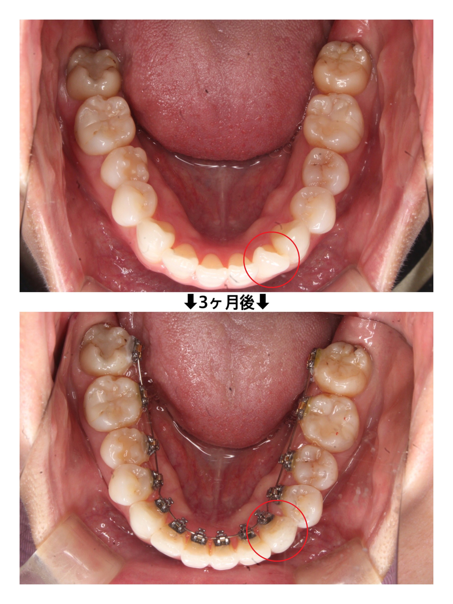 下の歯は表側に装置を取りつけていますが、唇で隠れやすいため比較的目立ちにくく、人前で話す機会が多いお仕事の方にも適しています。