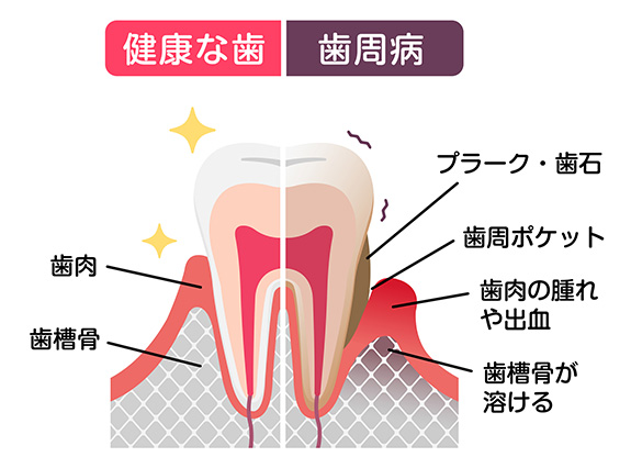 歯周病は、歯垢の中の細菌によって歯ぐきに炎症を引き起こす病気のことです。進行すると歯を支える骨が溶けてしまい、適切な治療を受けないで放置すると歯が揺れ動いて抜け落ちてしまうことも。歯周病が進行することによって歯肉退縮を生じることもありますが、歯周病治療によって歯ぐきが引き締まるとブラックトライアングルが出現することがあります。