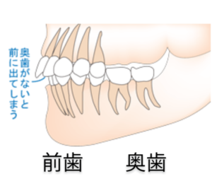 失った歯の後ろ側の歯が前に倒れてきたり、咬み合わせている歯がのびてきたりすることで奥歯の噛み合せが、低くなってしまうことがあります。