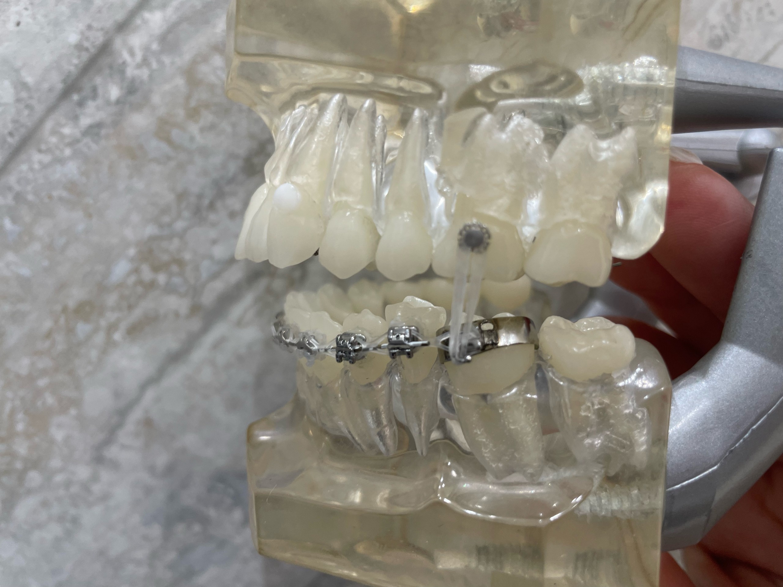 ここで使用するゴムは『顎間ゴム』と呼ばれ、上下の歯をしっかり咬ませたり正中を合わせるために用いられます。これを『ゴムかけ』と言います。