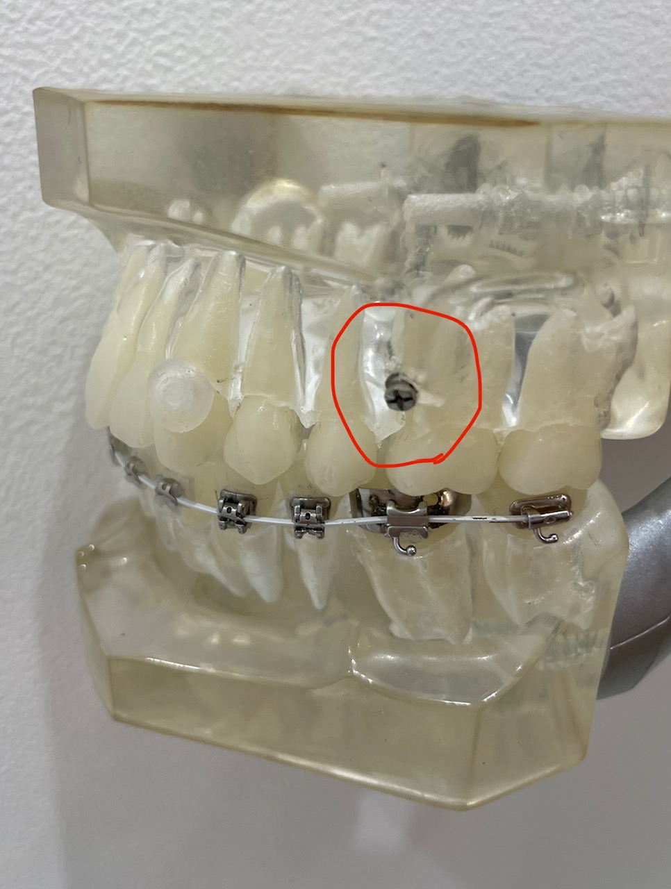 また、奥歯を後方に移動させる場合には「矯正用インプラントアンカースクリュー」と呼ばれる小さなネジを顎の骨に埋め込み治療を進めます。このスクリューを固定源にしてゴムやチェーンを歯に引っ掛け、歯全体を後方に移動させるのです。