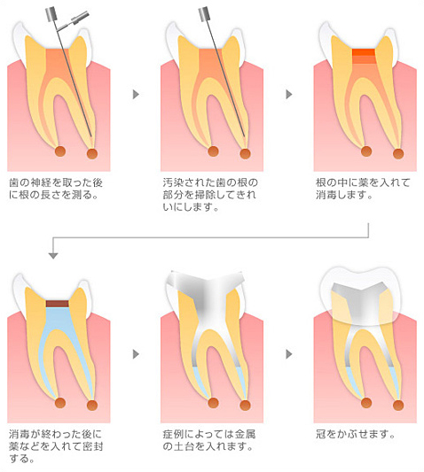 初期の段階で症状がなければ、通常の根管治療のように被せ物や歯を削って根管内を無菌状態にした後、神経の代わりとなる薬を詰めて蓋をします。その後、しばらくレントゲンなどで確認しながら経過観察します。完治には数ヶ月を要します。