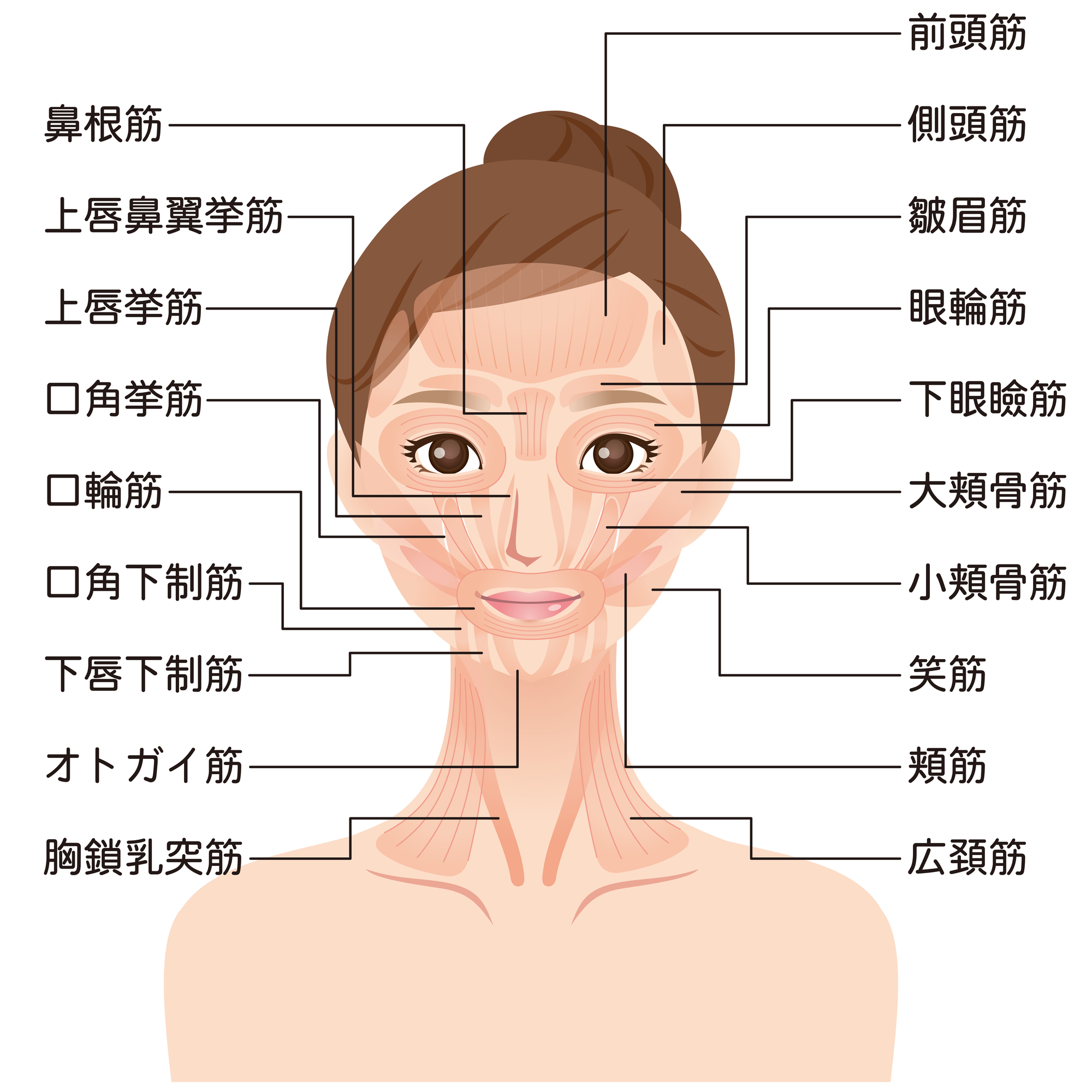 お口の周りの筋肉には、オトガイ筋・顎舌骨筋・口輪筋・頬筋があります。