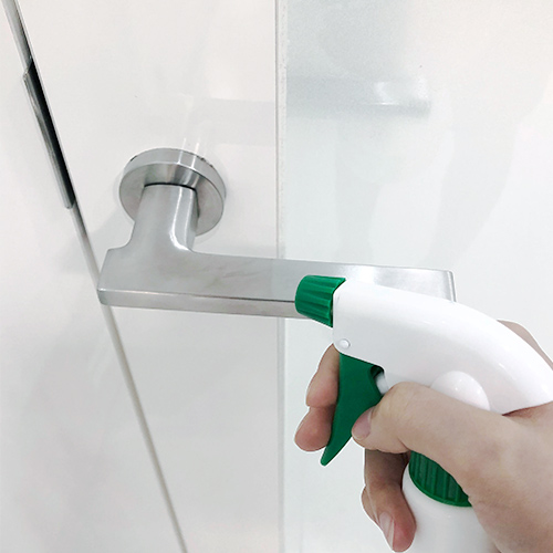 ドアノブ・取っ手、待合室チェアへの消毒液による払拭清掃。