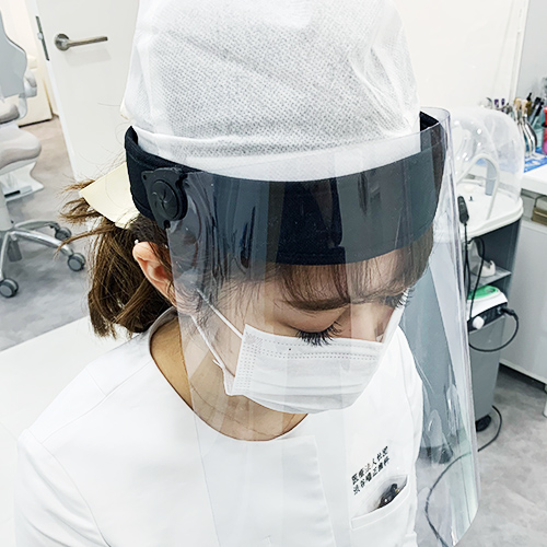 施術中はヘッドキャップ・フェイスシールドを着用。