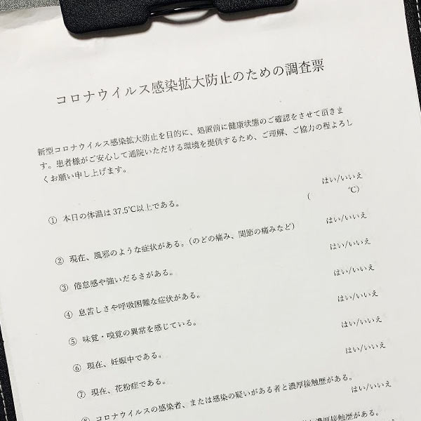 ご来院時の体調チェックと手指のアルコール消毒を実施。