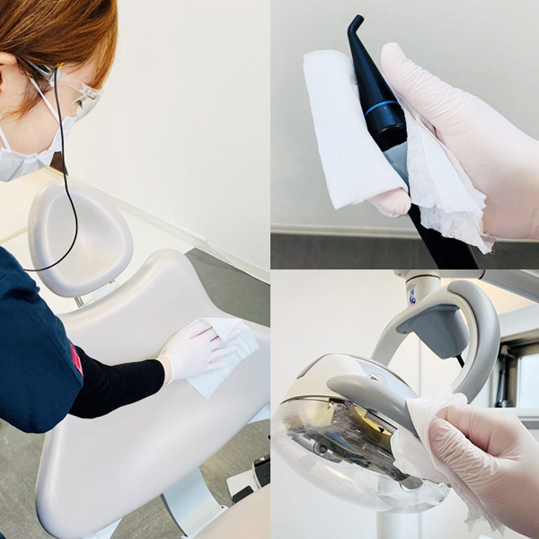 診療チェアー・操作パネル等の消毒液による払拭清掃。