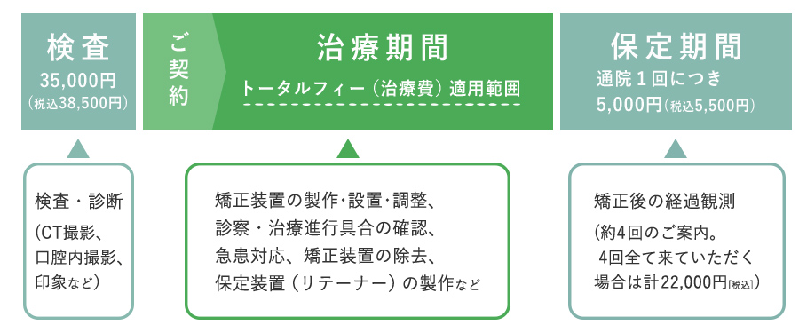 総額制は、料金表に書かれた金額に、毎回の処置費用が含まれている料金制度です。そのため、毎回の通院時に処置料を支払う必要はなく、矯正治療に必要な総額も分かりやすい特徴があります。博多矯正歯科 KITTE博多院はこのトータルフィー制度をとっています。
