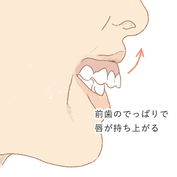 上顎の骨が縦に長い場合や、上顎の骨が前に出ている上顎前突(出っ歯)の場合にガミースマイルを引き起こしやすくなります。唇に対し、上顎の歯茎のアーチ部分が相対的に長くなるので、歯茎部分が唇に収まりきらずに出ます。逆に言うと歯茎部分が上唇を押し上げてしまい、歯茎が露出してしまうのです。