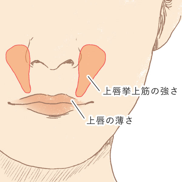 上唇を持ち上げる筋肉が発達しすぎている場合や、上唇自体が縦に短い場合など、唇に原因があることもあります。上唇挙上筋の働きが強い場合、必要以上に上唇が持ち上げられて歯茎が見えすぎてしまいますし、唇が薄い場合には、本来唇で隠れる部分の歯茎が見えやすくなってしまいます。