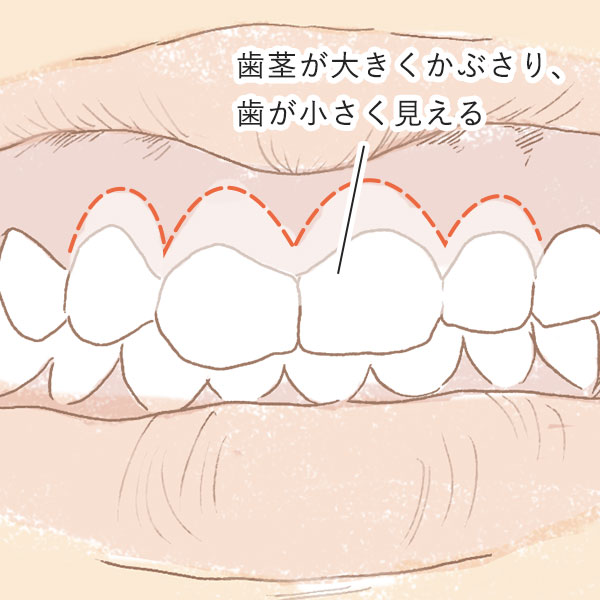 歯茎が発達しすぎたり、歯茎部分が本来よりも歯に覆いかぶさっている(歯茎の中に埋まっている歯の面積が多い)場合などがあります。これは歯茎だけの問題ではなく、歯並び、歯の大きさ等のいくつかの問題が重なり合って起きている場合が多く見られます。