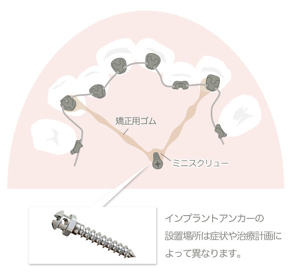 「歯科矯正用アンカースクリューを用いた治療」とは、歯科矯正用のミニスクリュー(アンカースクリュー)を用いることで、歯の大きな移動を必要とする場合もスピーディーに歯を動かすことのできる矯正技術です。「インプラント」という単語を聞くと、入れ歯の代わりに歯を再生する「インプラント治療」と間違われることがありますが、まったく異なる「矯正のオプション治療」です。