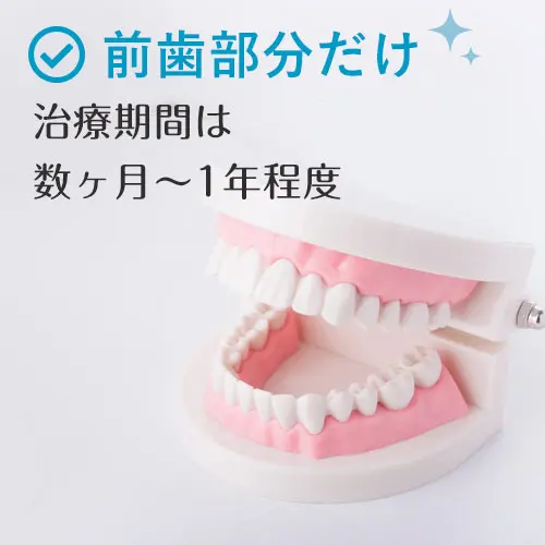 部分矯正の対象は「症状が軽微」で「比較的動きやすい」前歯部分となるので、期間面での負担が少なく、数ヶ月〜 1 年程度で、綺麗な歯並びが実現します。(※治療期間は症状によって異なります。詳細はお尋ねください。)