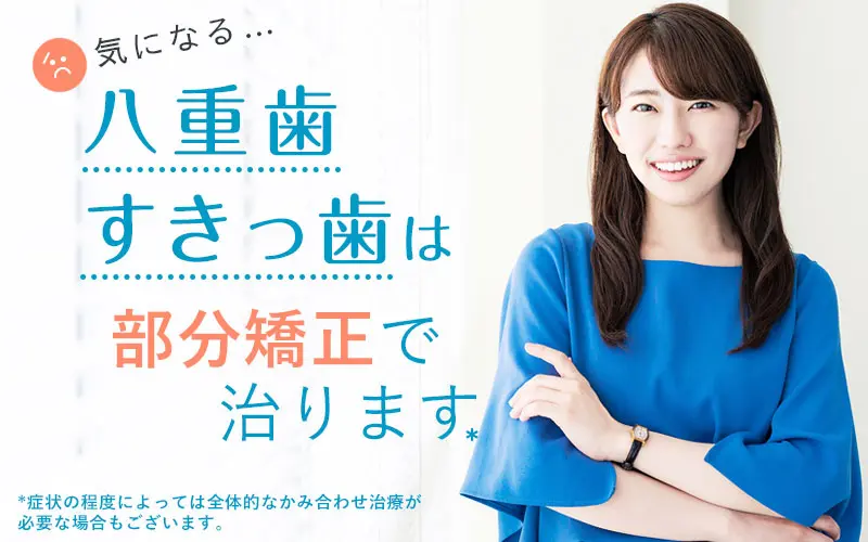 部分矯正で対応が可能なのは比較的軽い症状です。歯並びは悪い方ではないが、前歯の1、2本がねじれてしまっている、歯の隙間が空いているといった症状には部分矯正が有効です。