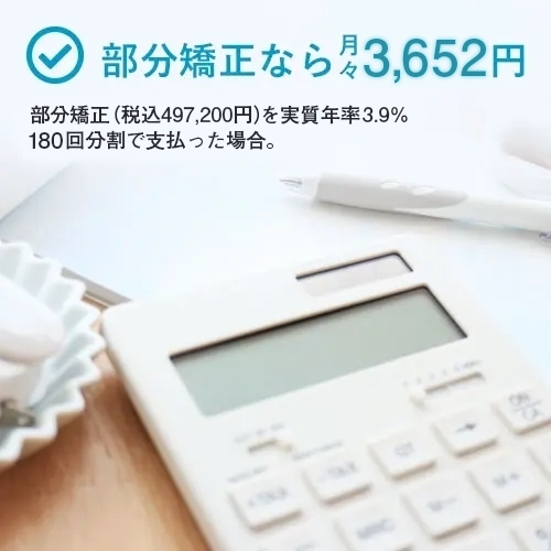 矯正装置の設置範囲、歯のコントロール範囲が少なく、治療期間も短いため、治療費の設定は全体矯正よりも低く設定しています。詳しくは治療費用をご覧ください。詳しくは費用ページをご覧ください。